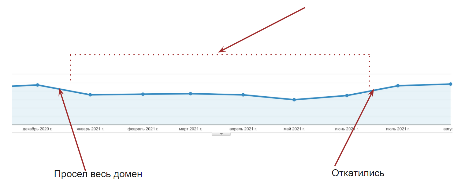 Ваши выводы и дальнейшие шаги зависят от того, где у вас произошло проседание: по всему домену или определенной нише. Почему я на этом делаю акцент? Потому что ваши работы при просадки всего домена должны отличаться от тех работ, которые вы будете производить в случае проседания какого-то определенного раздела: