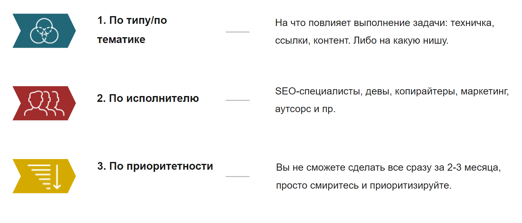 На реализацию плана может не всегда хватать ресурса. Поэтому чем лучше вы приоритизируете задачи, тем это будет эффективнее для сайта. Чтобы в выделенное время на SEO, например, команда разработки сделала то, что действительно для вас важно.